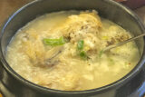 ①春菊のつけ根のかたい部分を除く。鍋にたっぷりの湯を沸かして、春菊の茎の部分だけを入れて30秒間ゆでたら、全体をさらに30秒間ゆでる