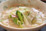 ⑤④にさけ、もずくを加えて味をみて塩で調え、水溶き片栗粉で薄くとろみをつけ、溶き卵を細く垂らして全体を混ぜ、青ねぎを加える