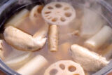 ④土鍋に熱湯、①の鶏肉を入れて煮立ててアクを取り、長ねぎ、にんにくの薄切りを加えて蓋をして中火で15分煮る