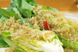 オリーブオイルでカリカリになるまで火を通したしらすをロメインレタスと合わせた新感覚のサラダ。
