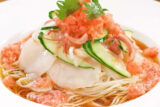 ホタテ貝柱のマリネと冷凍トマトのシャーベットをトッピングした志麻さん流アレンジそうめん。