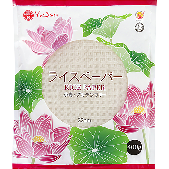 「ライスペーパー」…直径22cm・400gで約45枚入って321円。1枚約7円とコスパ抜群です。しかも1枚約30kcalと低カロリーな上、クセのない味わいでいろいろな料理に使えて便利。