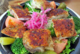⑧鶏肉が両面こんがり焼けたら長ねぎ、万能ポン酢タレを加え、なじんだら白ごまを加えて軽く炒めれば出来上がり