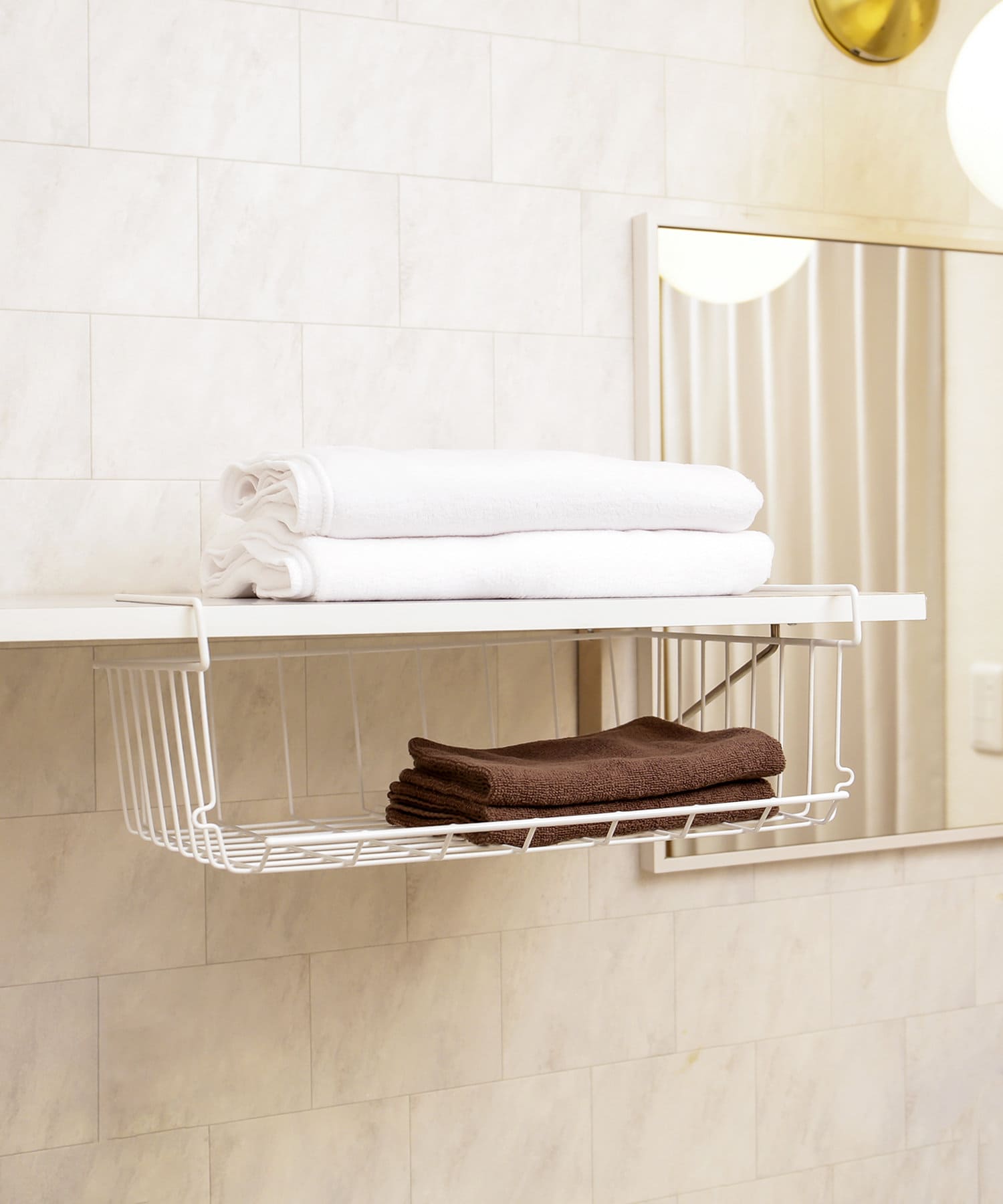 棚の下にできたデッドスペースに差し込むだけで簡単にオシャレな収納に早変わり。