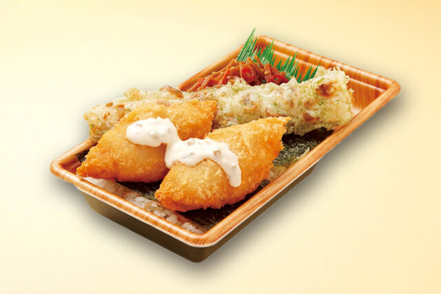 300円を切る低価格ながらご飯の上に敷き詰めたかつお節、海苔2枚、肉厚の白身フライ2つ、磯辺揚げ、きんぴらなど様々な味が楽しめるお弁当。
