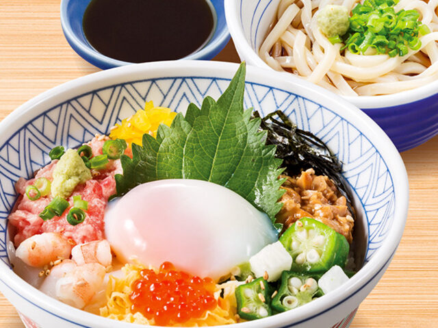 夢庵うまか丼の特徴はオクラ・長芋・納豆などのネバとろ食材に、いくら・ねぎとろ・いか・海老といった海鮮食材などに温泉卵を入れた14種類の豊富な具材。