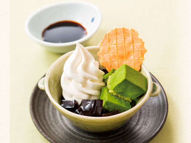 自家製抹茶ムースはおもに宇治茶を使用し、夢庵独自の濃厚な豆乳を加えることでヘルシーでさっぱりした味に仕上げています。