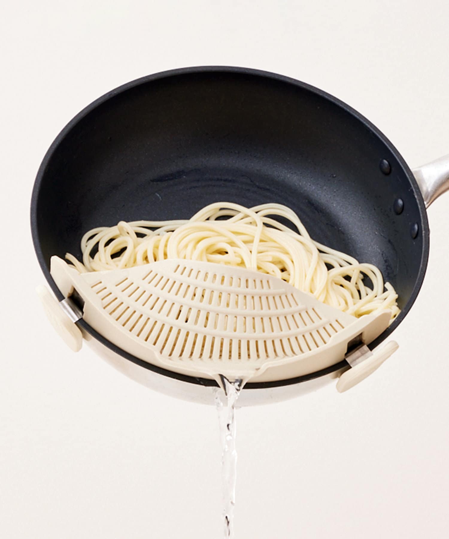 スリコがキッチンに革命を起こした大ヒットのザル&ボウルセットの最新型で、鍋やフライパンに取り付けて使えるクリップ式のザル。