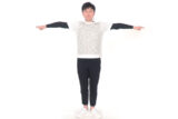 ①足を肩幅程度に開き、息を吸いながら両手をバンザイする
