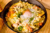 ソーセージを細かく切ることで断面から旨み・香りを出します。