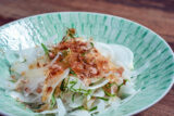 ②アルミ製など焦げ付き防止の加工をしていない鍋に新玉ねぎとにんにく、オリーブオイル、塩を入れる。全体を混ぜ合わせてから強火にかけ、音がしてくるまで1~2分炒める