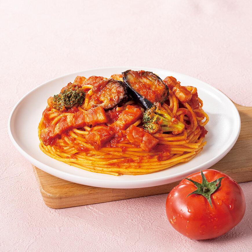 大きめにカットされた茄子のうま味と熟成ベーコンが満足感抜群のトマトパスタです。