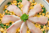 ①【A】をよく混ぜ合わせ、すし酢を作る。ボウルにご飯を入れ、すし酢をしゃもじで受けて全体に回しかけ、切るように混ぜる。混ぜるのをやめ、うちわであおぐ。ご飯の表面につやが出るまで、この作業を3~4回繰り返す。ボウルにぬれ布巾をかぶせ、人肌程度まで冷ます