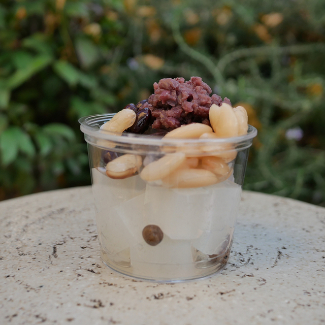 そこへトッピングのアイスをのせ、カリカリ食感の蕎麦の実をのせた絶品のあんみつです。