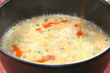 ④ナンプラーを加えて加熱し、水溶き米粉(米粉を水に溶かした物)を加えとろみをつける。ごま油とコショウで味を調える